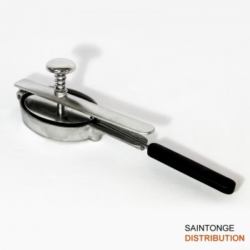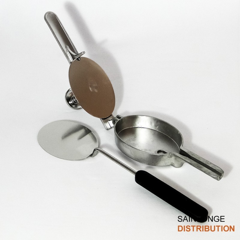 Presse en inox avec pelette ovale pour former et préparer les steaks hachés. Pellette de manutention en inox. Presse et moule de forme ovale.