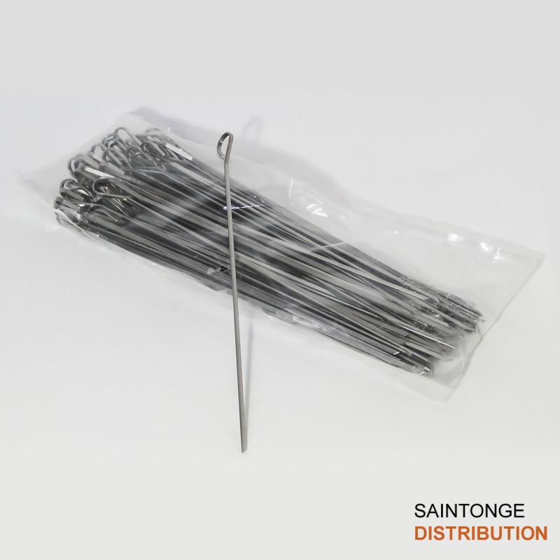 Baguettes à brochettes pour grill d’intérieur ou bien barbecue extérieur . La tige est en Inox plate de 3 mm de large, la finition en pointe à une extrémité et recourbée de l’autre, pour une longueur de 25 cm. Ces baguettes vous permettent de réaliser toutes vos envies, légumes, viandes, poissons, …