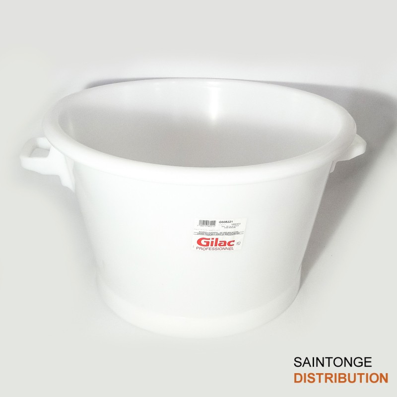 Bac rond Gilac blanc de 50 L , de 620mm de diamètre avec les poignées sur 340mm de haut . Diamètre intérieur Bas de 400mm. Il est en Polyéthylène Haute densité (PEHD). Large plage d’utilisation.