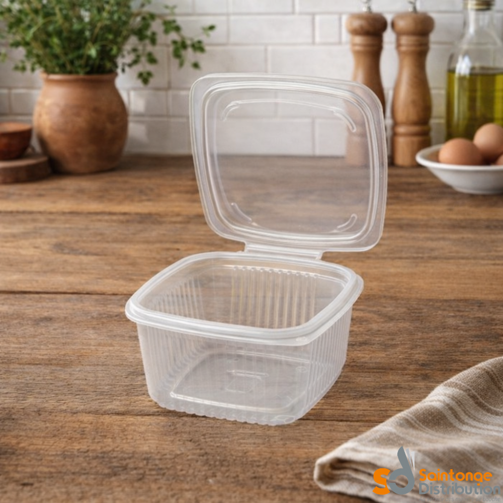 Fabriquée en polypropylène (PP) naturel, cette barquette assure robustesse et légèreté. Son couvercle charnière intégré permet une fermeture rapide et sécurisée, sans accessoire supplémentaire.