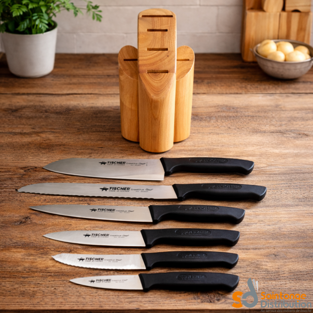 Le bloc en bois 6 couteaux Creative Chef Fischer Bargoin est la solution idéale pour disposer de tous les couteaux indispensables en cuisine, dans un seul et même support élégant et pratique. Conçu par la marque française Fischer Bargoin, reconnue pour son expertise en coutellerie professionnelle, ce set s’adresse aussi bien aux particuliers qu’aux professionnels.