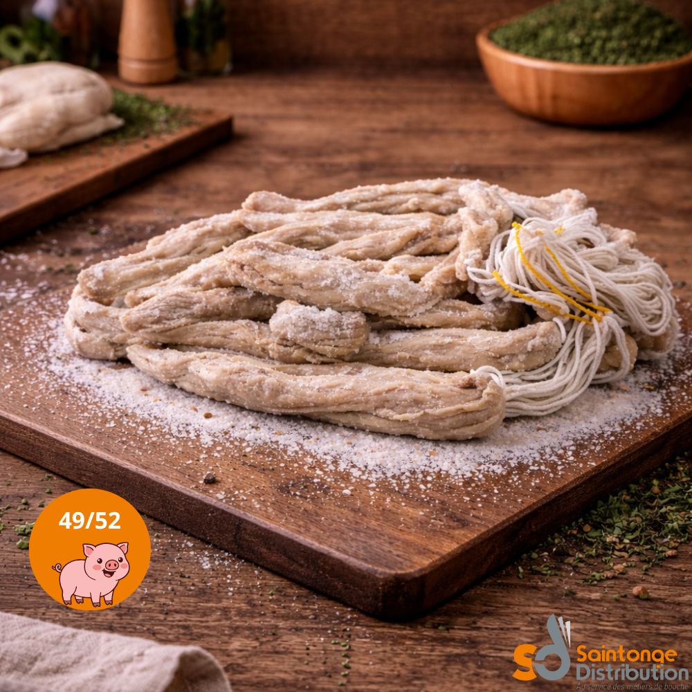 Les bouts de suivants 49/52 coupés et attachés, également appelés CAD suivants, sont des boyaux naturels de porc spécialement préparés pour faciliter la fabrication de spécialités charcutières traditionnelles. Conditionnés en seau de 100 pièces, ces suivants mesurent environ 30 cm de long et sont prêts à l’emploi, permettant un gain de temps appréciable en atelier.