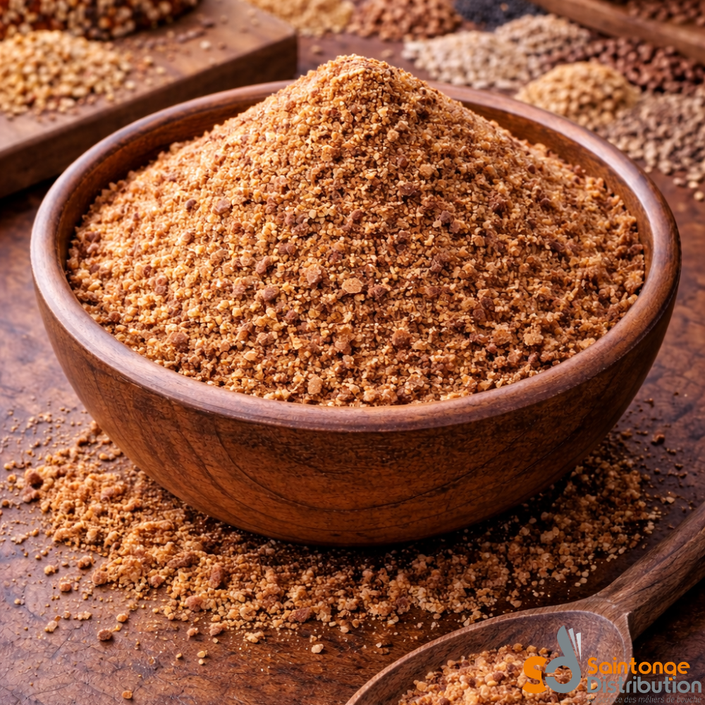 La chapelure brune est une panure alimentaire spécialement conçue pour offrir un enrobage croustillant, une adhérence optimale et une coloration foncée uniforme après cuisson. Elle est particulièrement appréciée pour les recettes nécessitant une panure plus prononcée et un goût légèrement toasté.