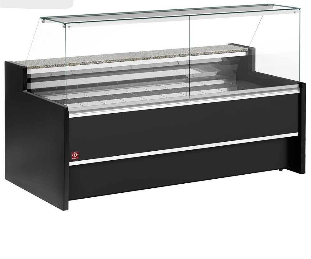Comptoir vitrine réfrigéré à vitre droite 90 ° , ventilé, avec réserve