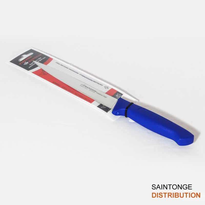 Couteau filet de la marque Fischer Bargoin avec sa lame de 17 cm en acier inoxydable et son manche bleu antibactérien.