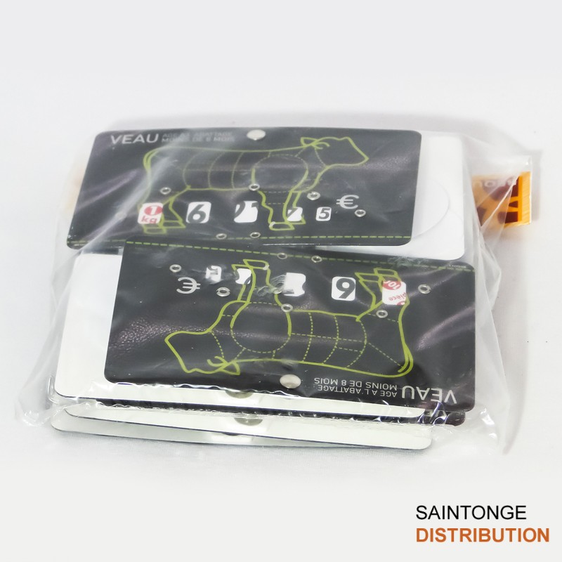 Étiquettes Presto Veau neutre de 8cm par 12cm avec 4 roulettes de changement de prix jusqu’à 99,99€. Pique inox. (par paquet de 10)