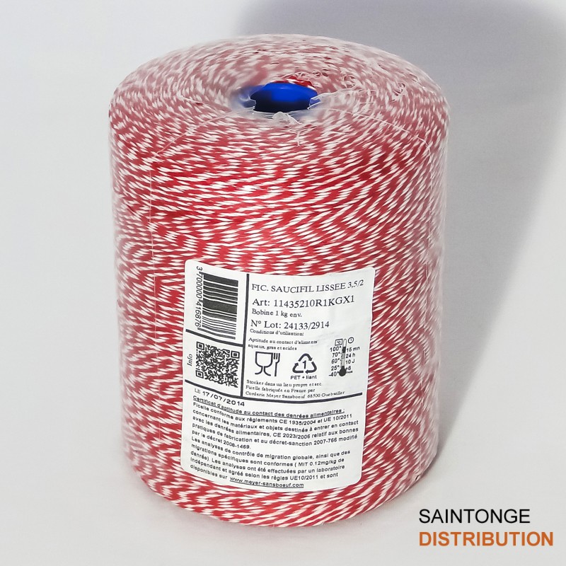Ficelle apte au contact des aliments aqueux, gras et acides. Sa fabrication française est conforme au règlement CE. Rolls de 1kg pour usage manuel.