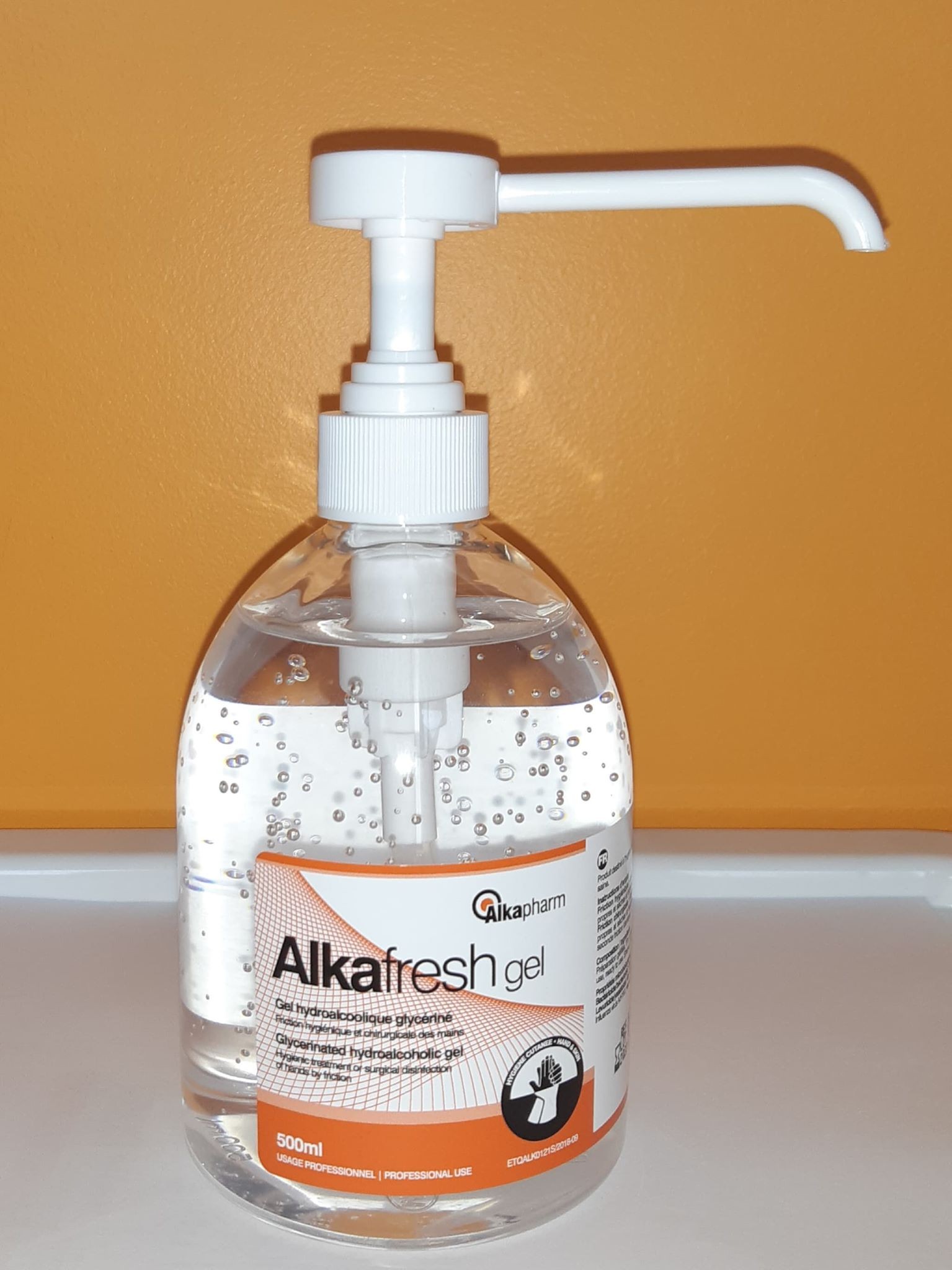 Gel hydroalcoolique glycériné en flacon de 500 ml (friction hygiénique et chirurgicale des mains).