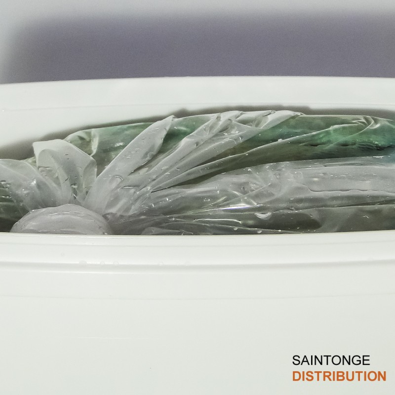 Produit conditionné en bac de saumure avec un bout par tube souple.