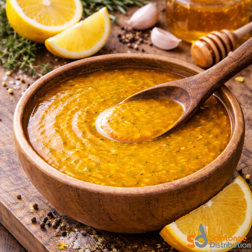 La Presti-Grill Miel/Citron est une marinade professionnelle conçue pour l’enrobage et l’assaisonnement de nombreux aliments. Elle associe la douceur du miel à l’acidité fraîche du citron, offrant un profil aromatique gourmand, léger et rafraîchissant.