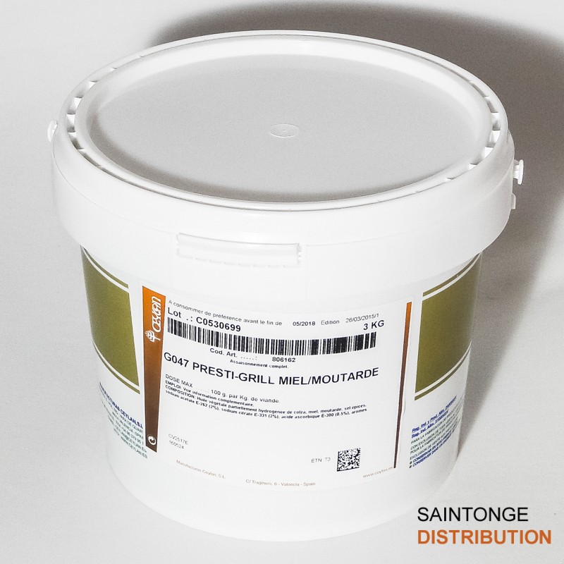 Sauce marinade d’enrobage complète et prête à l’emploi. Issue d’un mélange d’épices et arômes (colza, miel et moutarde).