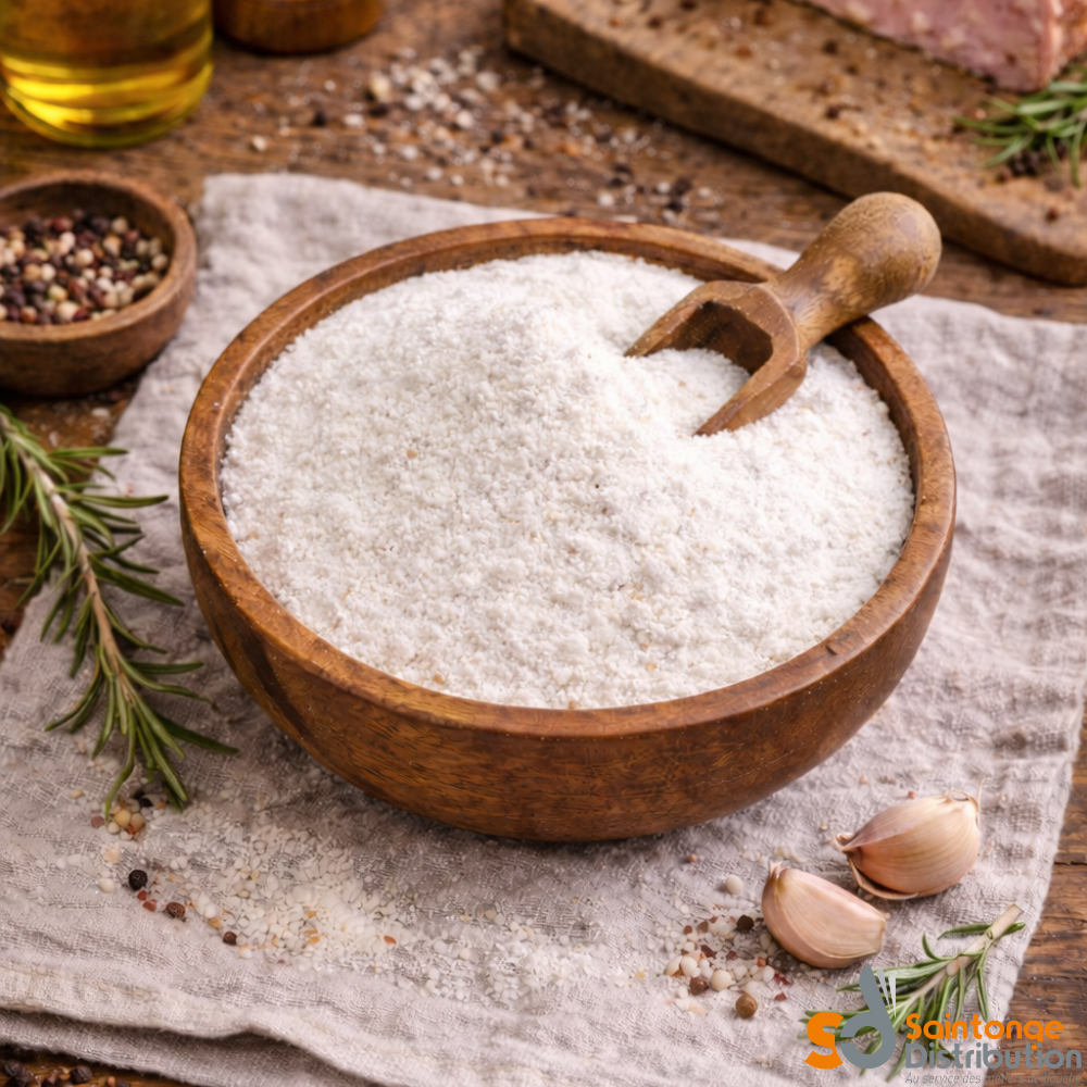 - Composition : Sirop de glucose, Sel, Ascorbate de sodium E301 (≤ 12,0 %), Extraits d’épices