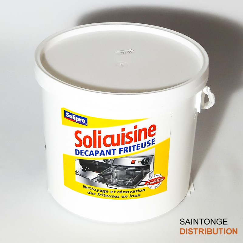 Solicuisine Décapant friteuse élimine toutes les graisses cuites ou brûlées grâce à l’apport combiné de plusieurs principes actifs (base, sel, agent de surface).