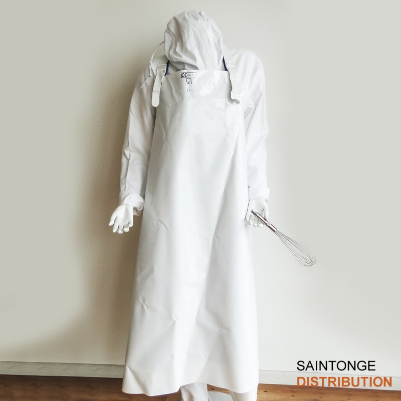 Tablier de service communément associé aux bouchers. Sa matière lui confère une grande souplesse et un facilité de nettoyage. Son système d’attache permet un grand maintien (élastique à la taille avec crochet et élastique au cou en plus du tour de cou réglable).